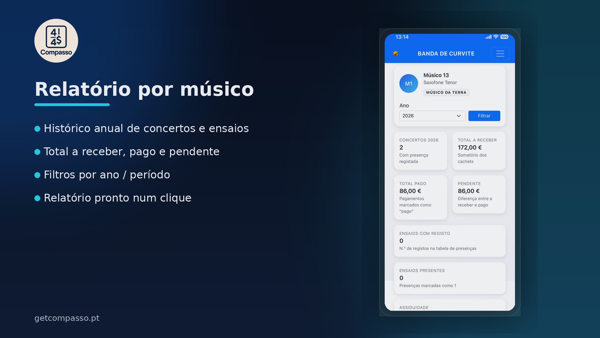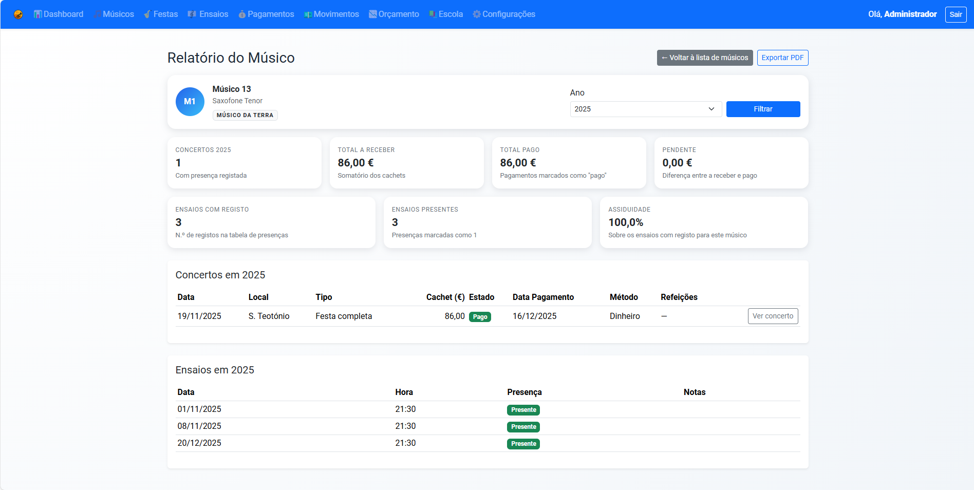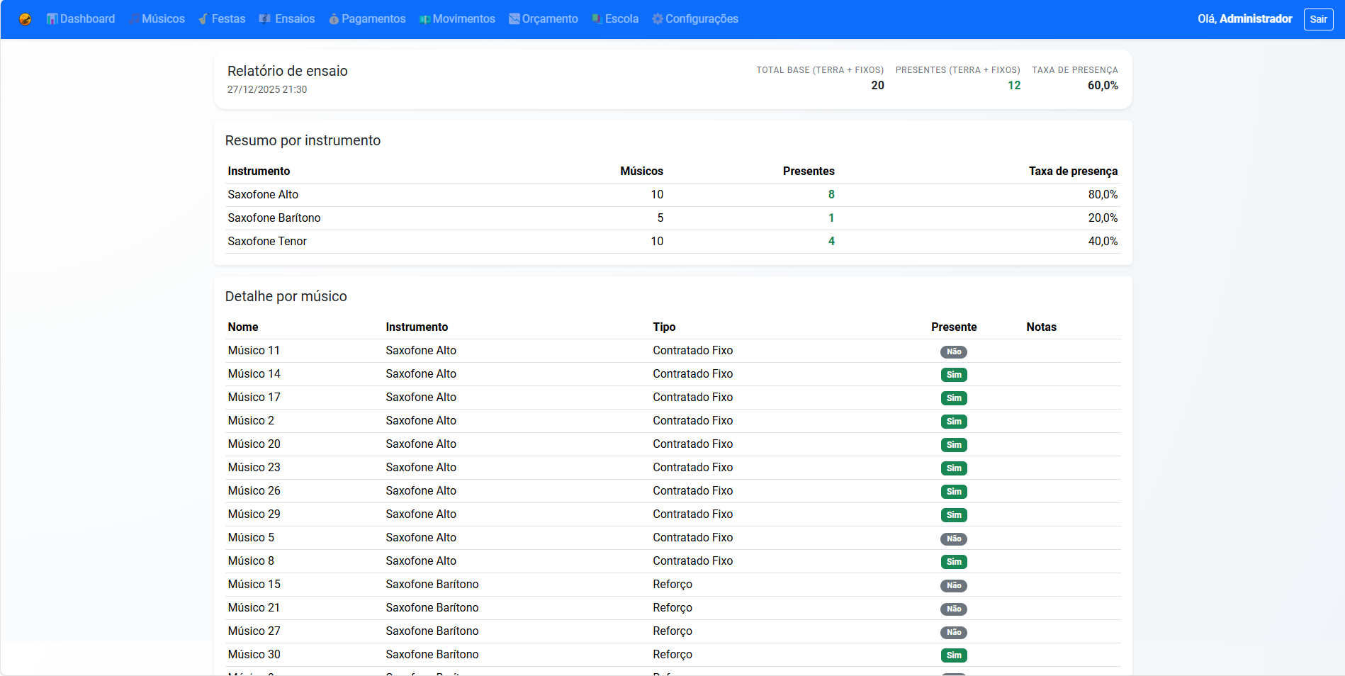 Relatórios por ensaio, anual, por músico e por naipe.