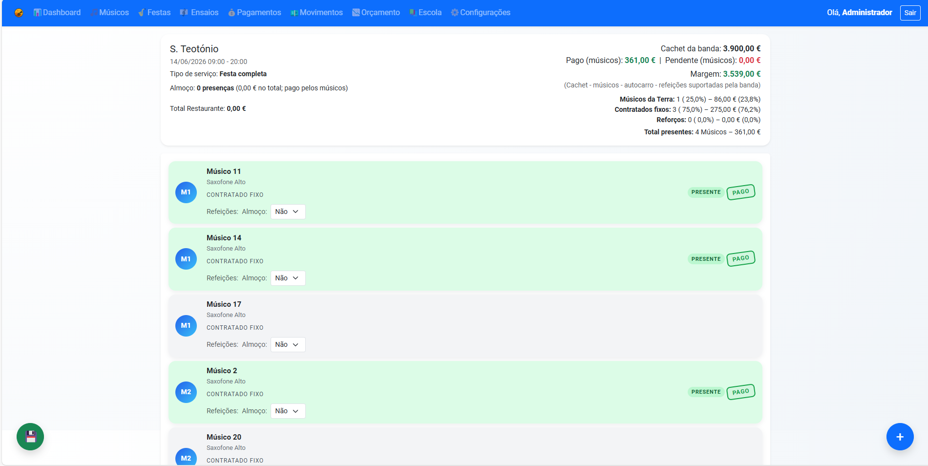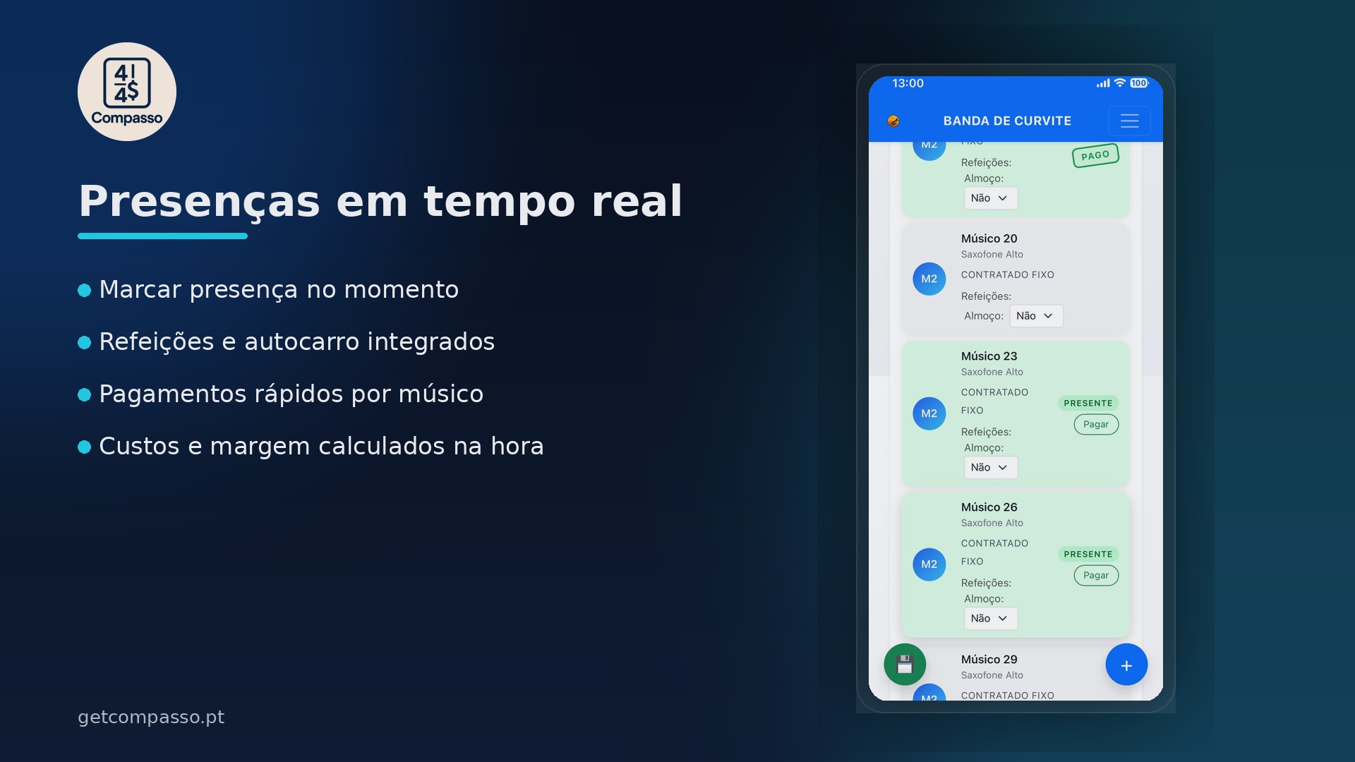 Marca presenças no momento e vê logo custos, pagamentos, pendentes e margem.