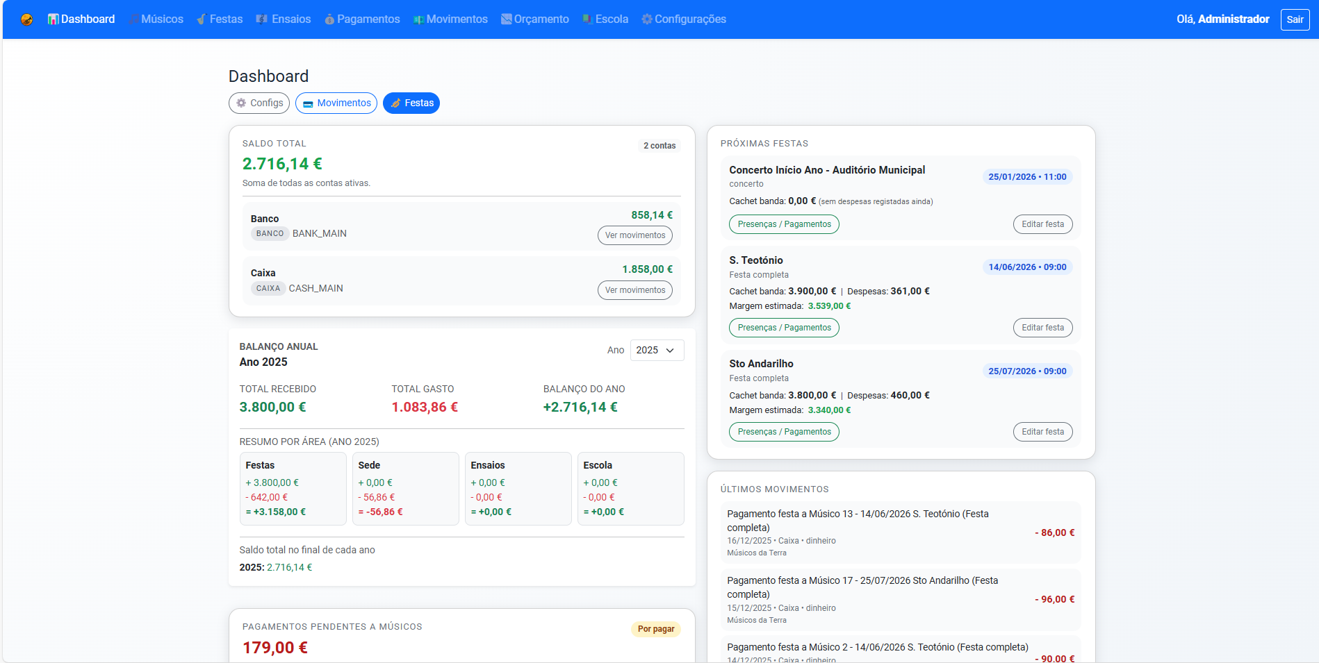 Histórico anual com festas, ensaios e valores recebidos, pronto num clique.